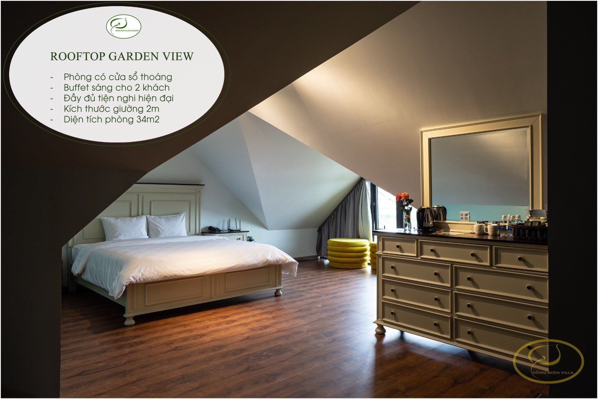 Phòng Rooftop Super King Bed Garden View tại Hồng Môn Hotel & Villa Đà Lạt là lựa chọn đẳng cấp với vị trí tầng thượng, mở ra tầm nhìn toàn cảnh vườn hồng xanh ngát và thành phố mờ sương. Không gian rộng rãi, thoáng đãng cùng ánh sáng tự nhiên tràn ngập mang đến trải nghiệm thư giãn tuyệt vời. Phòng trang bị giường Super King êm ái, WiFi tốc độ cao, minibar, TV màn hình phẳng và phòng tắm hiện đại – lý tưởng cho kỳ nghỉ lãng mạn hoặc những ai yêu thích sự riêng tư và yên bình.